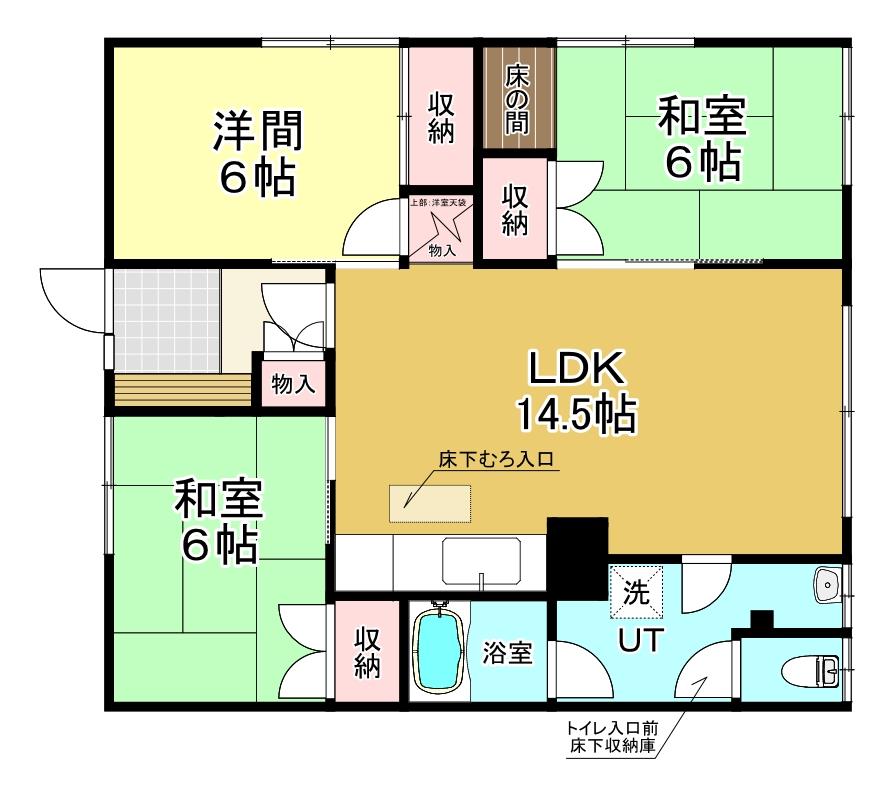 都市ガスガス、灯油暖房ストーブ有、バス・トイレ別、ウォシュレット、シャワー、洗面所、洗濯機置場、給湯、収納有り、床下収納有り、照明器具、TVドアホン、角部屋 |